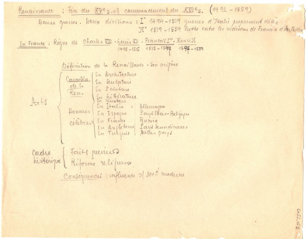 Χειρόγραφες σημειώσεις του Τώνη Σπητέρη για την ιταλική Αναγέννηση, χαρτί, 9 φφ, στα γαλλικά.