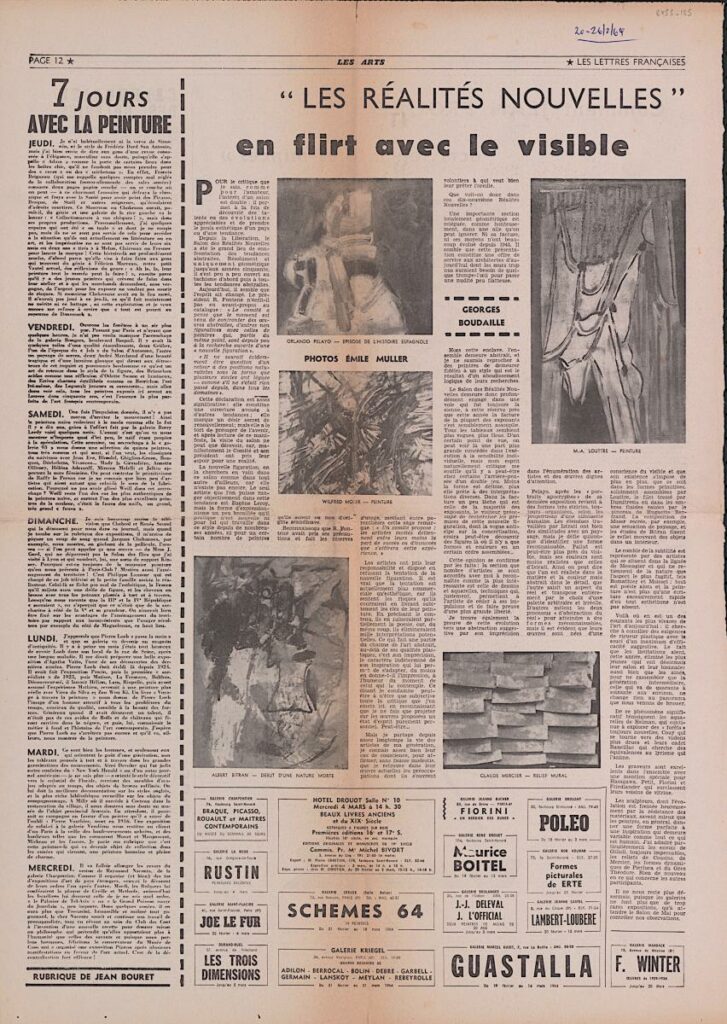 Απόκομμα, χαρτί, 60×43 εκ., στα γαλλικά, δημοσίευσης κριτικής του Salon des Réalités Nouvelles που διεξάγεται στο Παρίσι το 1964. Αναγράφονται λεπτομέρειες για την διοργάνωση, τους συμμετέχοντες καλλιτέχνες και τα έργα που παρουσιάζουν.