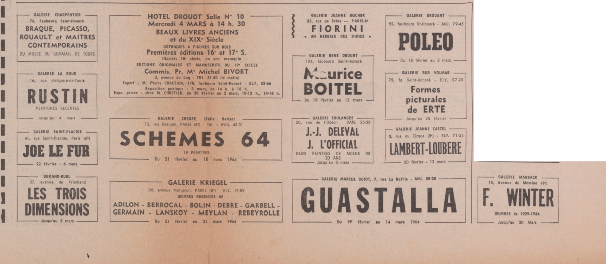 Απόκομμα, χαρτί, 60×43 εκ., στα γαλλικά, δημοσίευσης εκθεσιολογίου της περιόδου. Γίνεται αναφορά σε εκθέσεις των Rustin, Joe le Fur, σε ομαδική με έργα Braque-Picasso-Rouault και συγχρόνων τους, σε ομαδική με τίτλο “Schemes 64”, σε ομαδική των Adillon- Berrocal- Bolin- Debré, Garbell- Germain- Lanskoy- Meylan- Rebeyrolle, Fiorini, Boitel, Guastalla, Winter, Lambert- Louber, Poleo, Erté και σε ομαδική των Deleval και l’ Official.