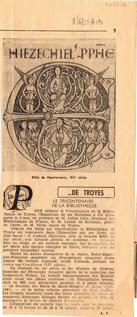 Απόκομμα, χαρτί, 27×12 εκ., στα γαλλικά, δημοσίευσης άρθρου του A.B. το οποίο αναφέρεται σε έκθεση που διοργανώνεται στην βιβλιοθήκη της Troyes στην Γαλλία για τον εορτασμό τριάντα χρόνων λειτουργίας της. Αναγράφονται λεπτομέρειες για τα έργα που παρουσιάζονται σε αυτή, από τη συλλογή της.