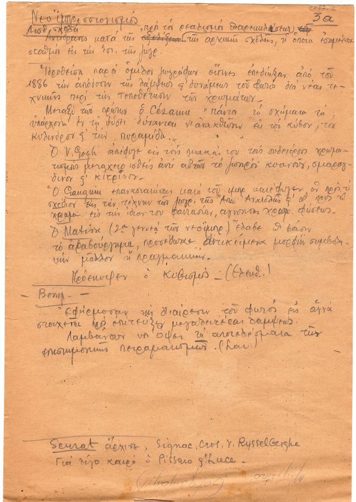 Χειρόγραφο κείμενο του Τώνη Σπητέρη, χαρτί, 32×22 εκ., με μολύβι στα ελληνικά και γαλλικά, με σημειώσεις για τον Νεο-ιμπρεσιονισμό. Αναφέρεται σε καλλιτέχνες και έργα τους.