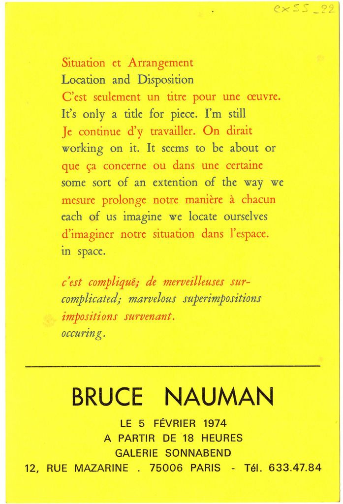 Έντυπο, χαρτόνι, 16,5×11 εκ., στα γαλλικά, έκθεσης Bruce Nauman, η οποία διεξάγεται στην γκαλερί Sonnabend στο Παρίσι. Βρέθηκε απεσταλμένη στον Τώνη Σπητέρη.