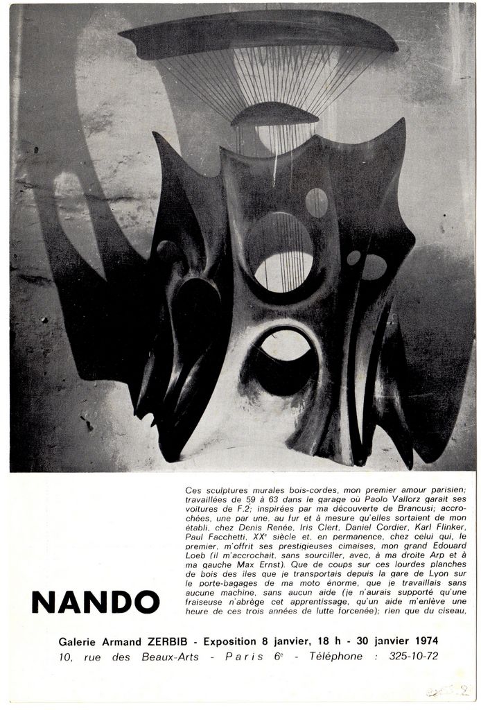 Έντυπο, χαρτόνι διπλής όψης, 22.5×15 εκ., στα γαλλικά, έκθεσης γλυπτικής του Nando στην γκαλερί Armand Zerbib στο Παρίσι. Αναγράφεται κείμενο για τα έργα του καλλιτέχνη.