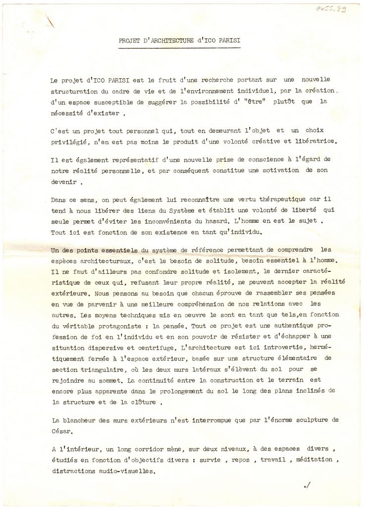 Φωτοαντίγραφο εντύπου, χαρτί, 4 φφ, στα γαλλικά. Περιέχει κείμενο της Barbara Radice αναφορικά με την ‘αρχιτεκτονική πρόταση’ του Ico Parisi και συνέντευξη του καλλιτέχνη στον Enrico Crispolti για το έργο του.