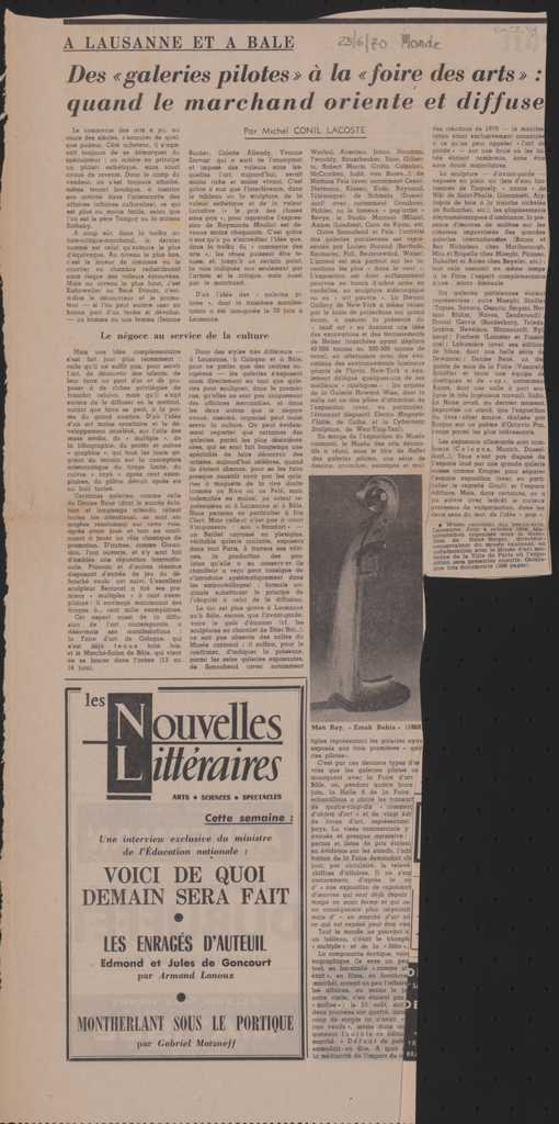 Απόκομμα, χαρτί ακανόνιστου μεγέθους, στα γαλλικά, δημοσίευσης κριτικής θεματικής έκθεσης των ‘galeries pilotes’ η οποία διεξάγεται στην Λωζάνη. Αναγράφονται λεπτομέρειες για την σύλληψη της διοργάνωσης, τις συμμετέχουσες γκαλερί και τα έργα που παρουσιάζονται.