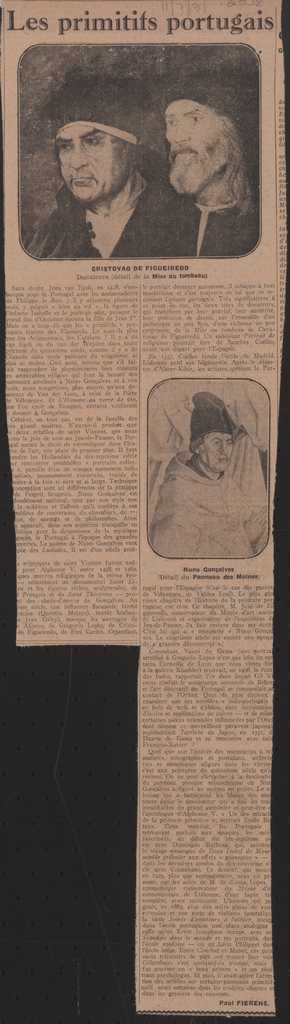 Απόκομμα, χαρτί ακανόνιστου μεγέθους, στα γαλλικά, δημοσίευσης κριτικής θεματικής έκθεσης πορτογαλικής τέχνης, η οποία διεξάγεται στο Musée du Jeu de Paume στο Παρίσι. Σχολιάζονται έργα που παρουσιάζονται σε αυτή καθώς και ιστορικά ζητήματα.