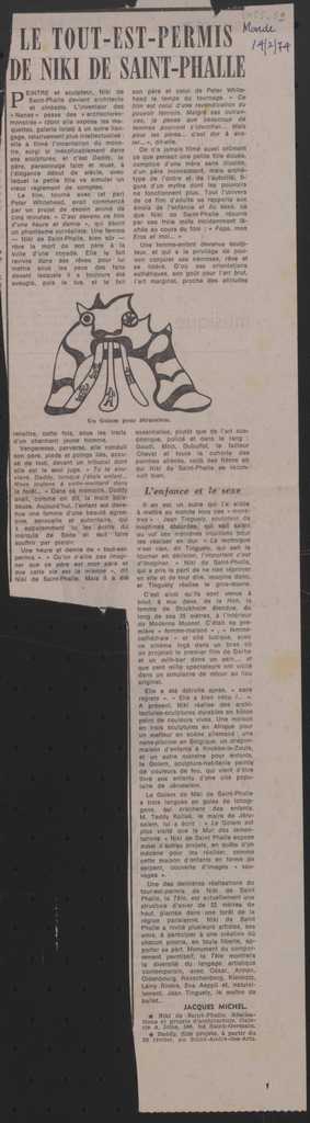 Απόκομμα, χαρτί ακανόνιστου μεγέθους, στα γαλλικά, δημοσίευσης κριτικής έκθεσης της Niki de Saint Phalle, η οποία διεξάγεται στην γκαλερί Ιόλα στο Παρίσι. Επίσης, σχολιάζεται ταινία της με τίτλο “Daddy” που προβάλλεται στην πρωτεύουσα. Σχολιάζεται η καλλιτεχνική της ματιά.