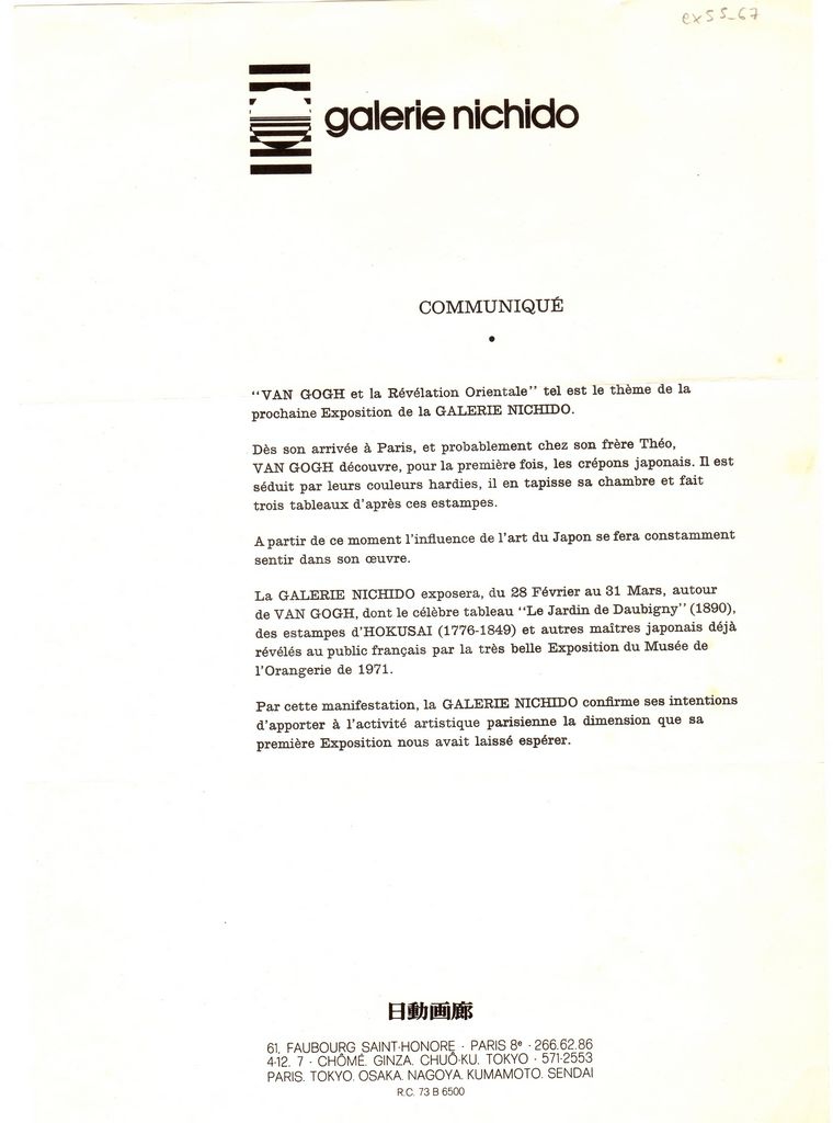 Φωτοαντίγραφο, χαρτί, 29.5×21 εκ., στα γαλλικά, δελτίου τύπου, έκθεσης Van Gogh η οποία διοργανώνεται στην γκαλερί Nichido στο Παρίσι. Αναγράφονται πληροφορίες για την διοργάνωση.