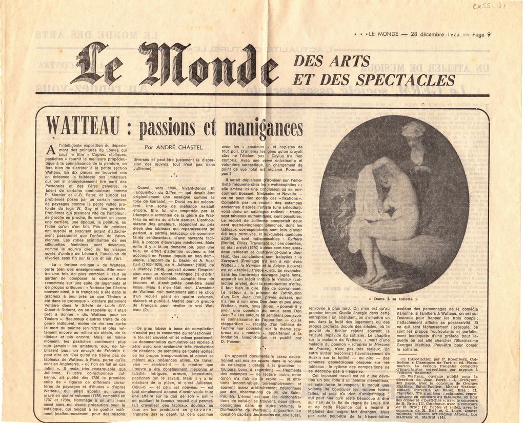 Απόκομμα, χαρτί, 27.5×34 εκ., στα γαλλικά, δημοσίευσης άρθρου το οποίο αναφέρεται στην ζωγραφική του Antoine Watteau, με αφορμή έκθεση με τίτλο “Copies, Repliques, Pastiches”, η οποία διεξάγεται στο Λούβρο, όπου παρουσιάζονται έργα του καλλιτέχνη.