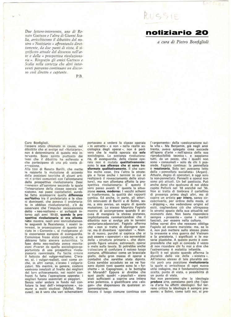 Απόκομμα, χαρτί, 2 φφ, 29.5×21 εκ., στα ιταλικά, δημοσίευσης της στήλης “Notizario”, στην οποία αναδημοσιεύονται επιστολές των Renato Guttuso και Gianni Scalia στις οποίες αναγράφουν απόψεις τους σχετικά με την τέχνη.