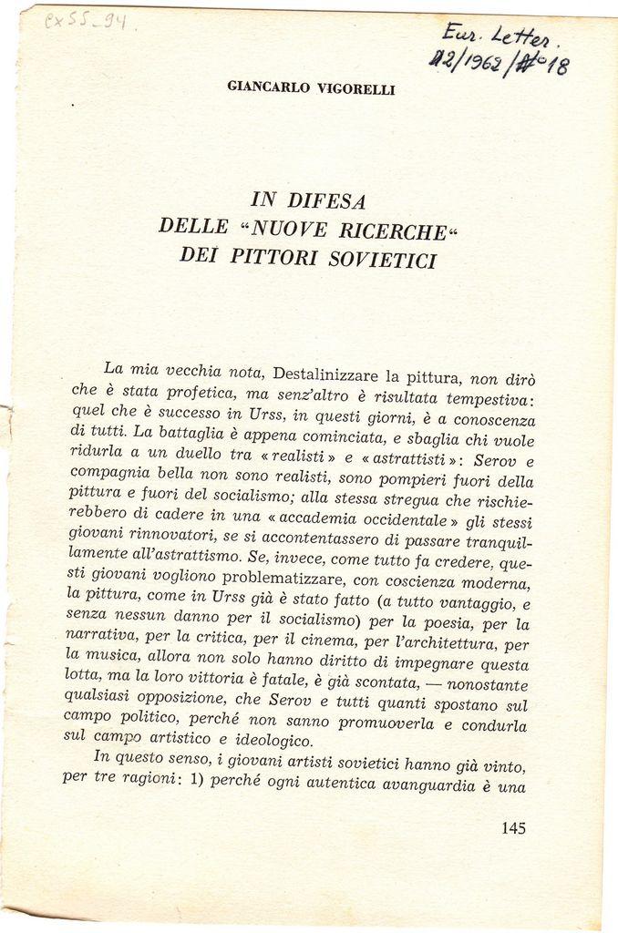 Απόκομμα, χαρτί διπλής όψης, 20.5×14 εκ., στα ιταλικά, δημοσίευσης άρθρου το οποίο αναφέρεται στους νέους καλλιτέχνες της Σοβιετικής Τέχνης και στην προοδευτική ματιά στο έργο τους.
