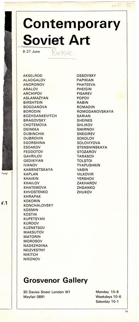 Απόκομμα, χαρτί, 31×13 εκ., στα αγγλικά, με τους συμμετέχοντες καλλιτέχνες σε ομαδική έκθεση σύγχρονης σοβιετικής τέχνης, στην Grosvenor Gallery του Λονδίνου. Συμμετέχουν οι: Akselrod, Aladgalov, Andronov, Aralov, Archipov, Aslamazyan, Birshtein, Bogdanova, Borodin, Bozhdankevitch, Bragovsky, Chotemova, Deineka, Dubinchik, Dubrovin, Egorshina, Esdakov, Feodotov, Gavrilov, Gedikiyan, Ivanov, Kamenetskaya, Kaplan, Khaikin, Khailov, Khatemova, Khvostenko, Khrapak, Kokorin, Konchalovsky, Kosmin, Kostin, Kupetsyan, Kurdov, Kuznetsov, Maksutov, Matorin, Morosov, Nadezhdina, Neizvestny, Nikitch, Nikonov, Ossovsky, Papikian, Phateeva, Pheigin, Pisarev, Popov, Rabin, Romadin, Romodanovskaya, Sarian, Sheines, Shlikov, Smirnov, Snegirev, Sokolov, Soloviyova, Stenshinskaya, Stozarov, Trasov, Tolstoi, Tyapushkin, Vasin, Vilkovir, Yerhsov, Zakharov, Zhdanko, Zhukov.