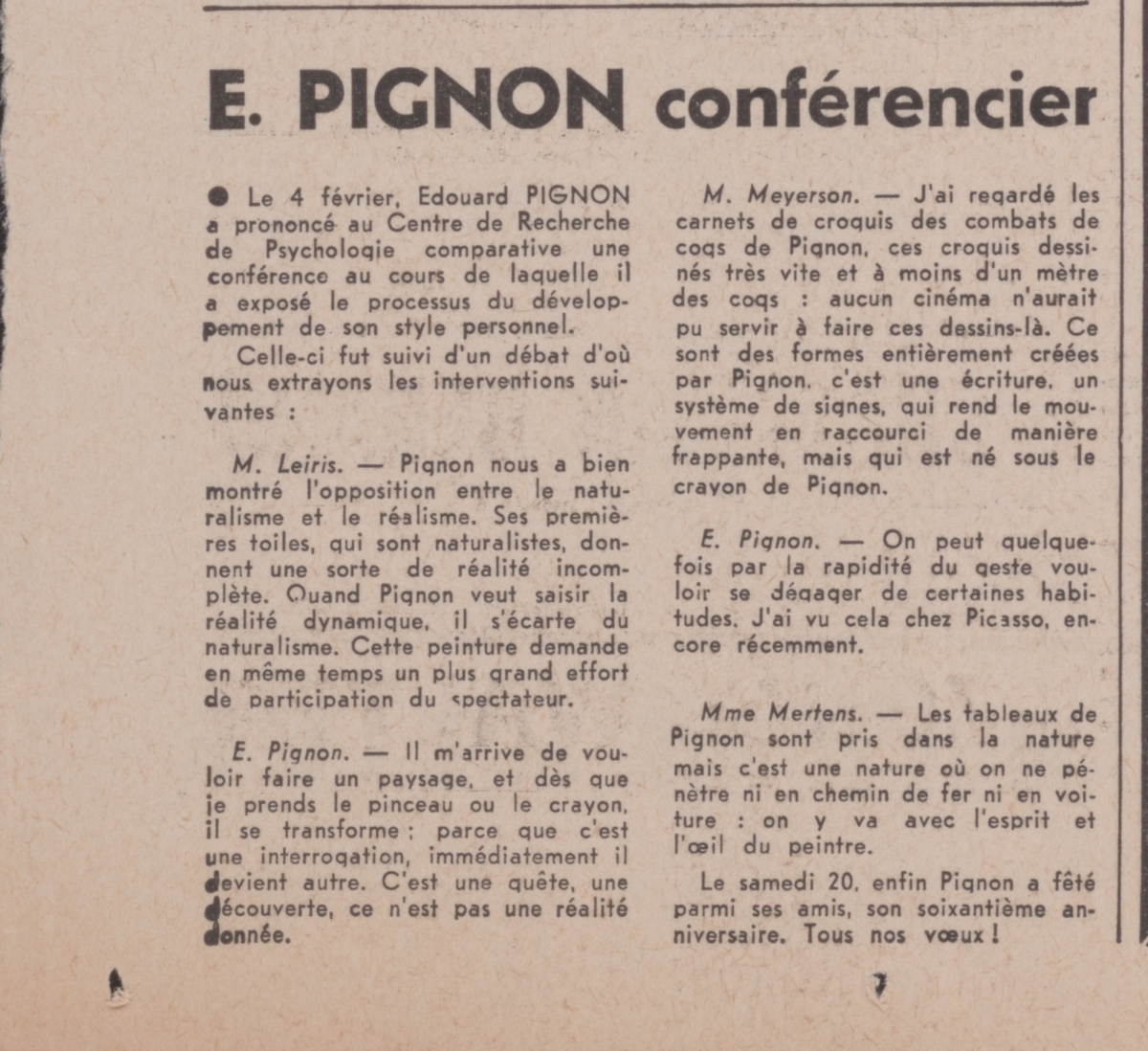 Απόκομμα, χαρτί, 60×43 εκ., στα γαλλικά, δημοσίευσης άρθρου αναφερόμενου σε διάλεξη του Edouard Pignon στο Centre de Recherche et de Psychologie του Παρισιού, στην οποία ανέπτυξε ζητήματα για το εικαστικό του έργο. Δίνεται απόσπασμα από ερωτήσεις των M. Leiris και Mme Mertens προς τον καλλιτέχνη.