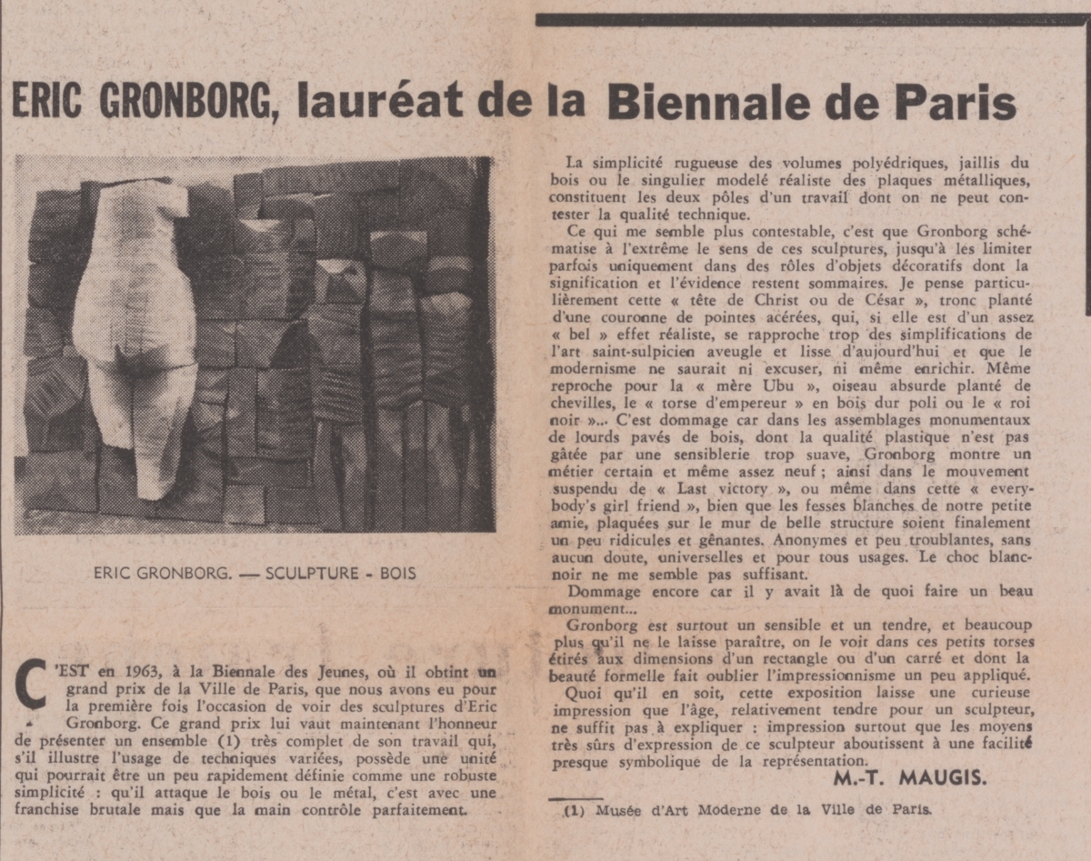 Απόκομμα, χαρτί, 60×43 εκ., στα γαλλικά, δημοσίευσης κριτικής έκθεσης Erik Gronborg, η οποία διεξάγεται στο Μουσείο Μοντέρνας Τέχνης στο Παρίσι.