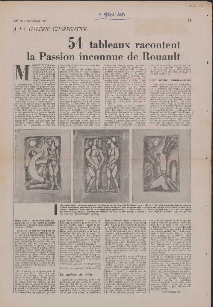 Απόκομμα, χαρτί διπλής όψης, 43×30 εκ., στα γαλλικά, δημοσίευσης κριτικής έκθεσης Georges Rouault, η οποία διεξάγεται στην γκαλερί Charpentier στο Παρίσι. Σχολιάζονται τα έργα του καλλιτέχνη που παρουσιάζονται σε αυτή.