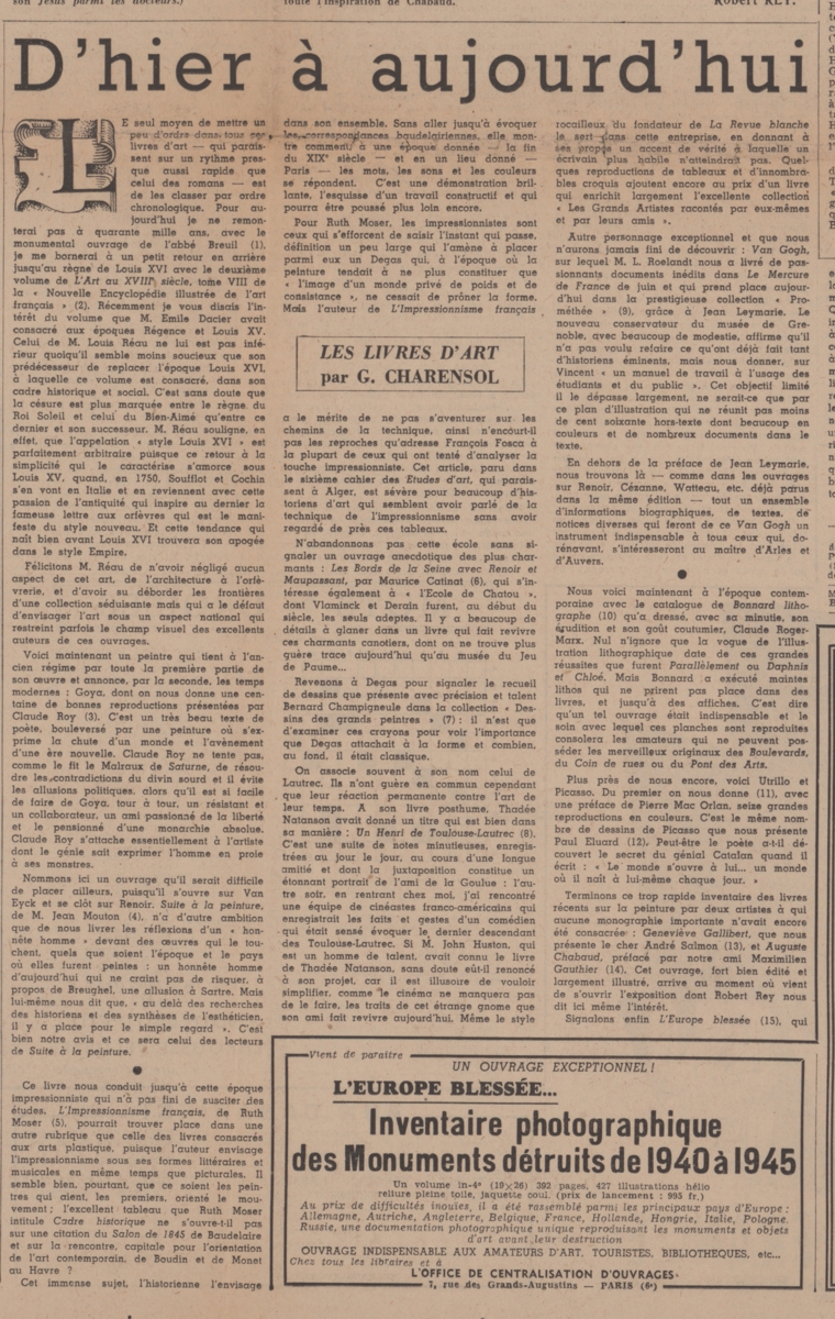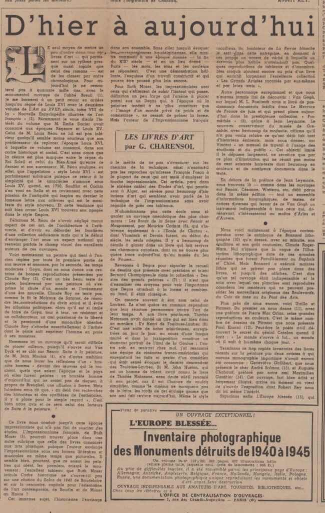 Απόκομμα, χαρτί, 60×43 εκ., στα γαλλικά, δημοσίευσης στήλης του εντύπου με βιβλιοκριτικές της περιόδου. Σχολιάζονται κυκλοφορίες για τον Λουδοβίκο 15ο, για την τέχνη του 18ου αιώνα, για τον Goya, για την ζωγραφική με τίτλο “Suite à la peinture”, για τον γαλλικό ιμπρεσιονισμό, για την γαλλική σχολή ζωγραφικής με τίτλο “Les Bords de la Seine avec Renoir et Maupassant”, για σημαίνοντες καλλιτέχνες με τίτλο “Dessins de grands peintres”, για τον Toulouse Lautrec, για τον Van Gogh, για τον Bonnard, για τον Utrillo, την Gen. Gallibert και τον Auguste Chabaud.