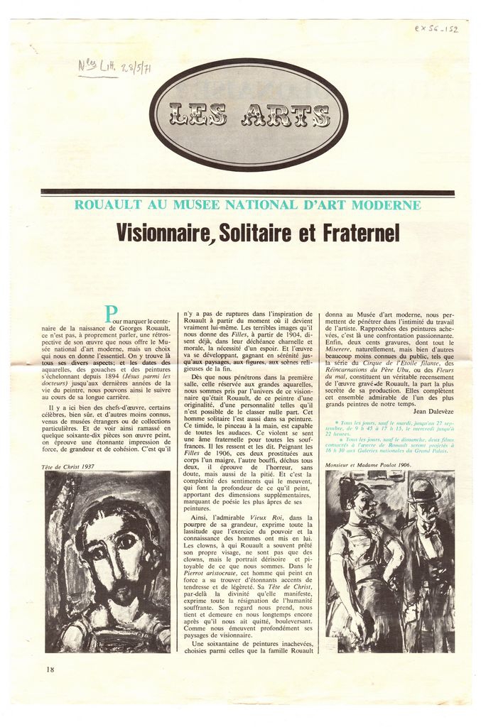 Απόκομμα, χαρτί, 37×25 εκ., στα γαλλικά, δημοσίευσης κριτικής αναδρομικής έκθεσης Georges Rouault, η οποία διεξάγεται στο Μουσείο Μοντέρνας Τέχνης στο Παρίσι. Σχολιάζεται η ζωγραφική του.