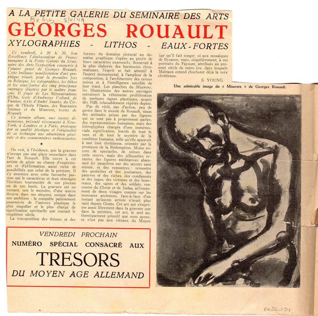 Απόκομμα, χαρτί, 23×25 εκ., στα γαλλικά, δημοσίευσης κριτικής έκθεσης Georges Rouault, η οποία διεξάγεται στην Petite Galerie du Séminaire des Arts στο Παρίσι. Σχολιάζεται το περιεχόμενό της.