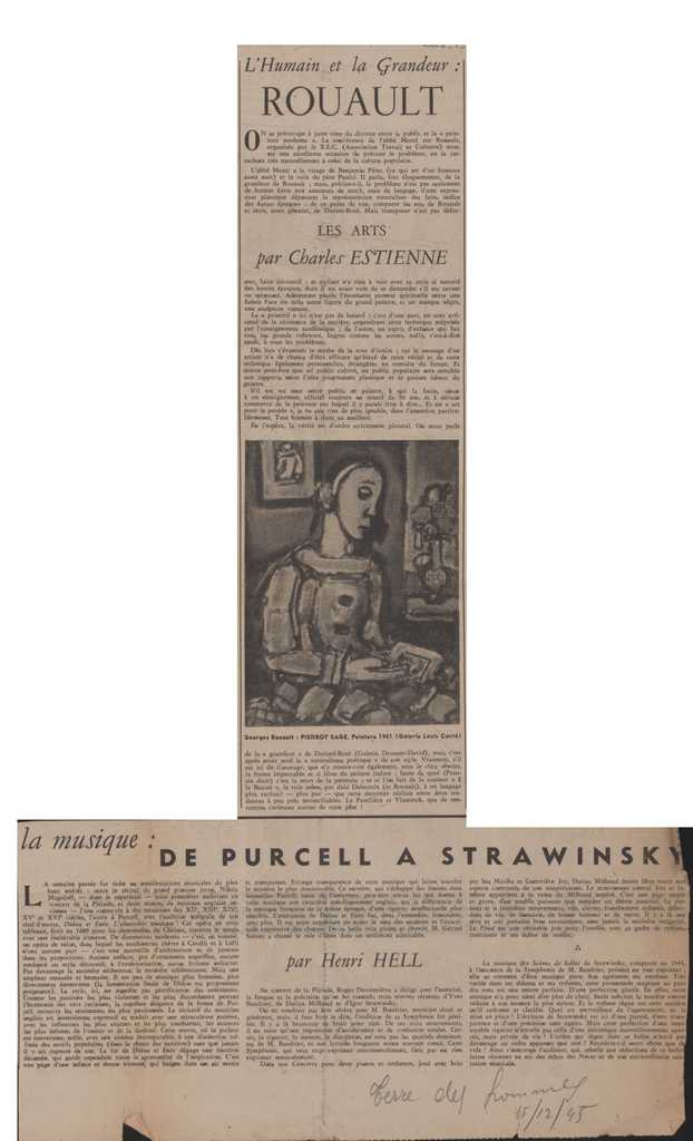 Απόκομμα, χαρτί ακανόνιστου μεγέθους, στα γαλλικά, δημοσίευσης άρθρου αναφερόμενου σε διάλεξη του abbé Morel για τον Georges Rouault, η οποία πραγματοποιήθηκε στην Association Travail et Culture στο Παρίσι.