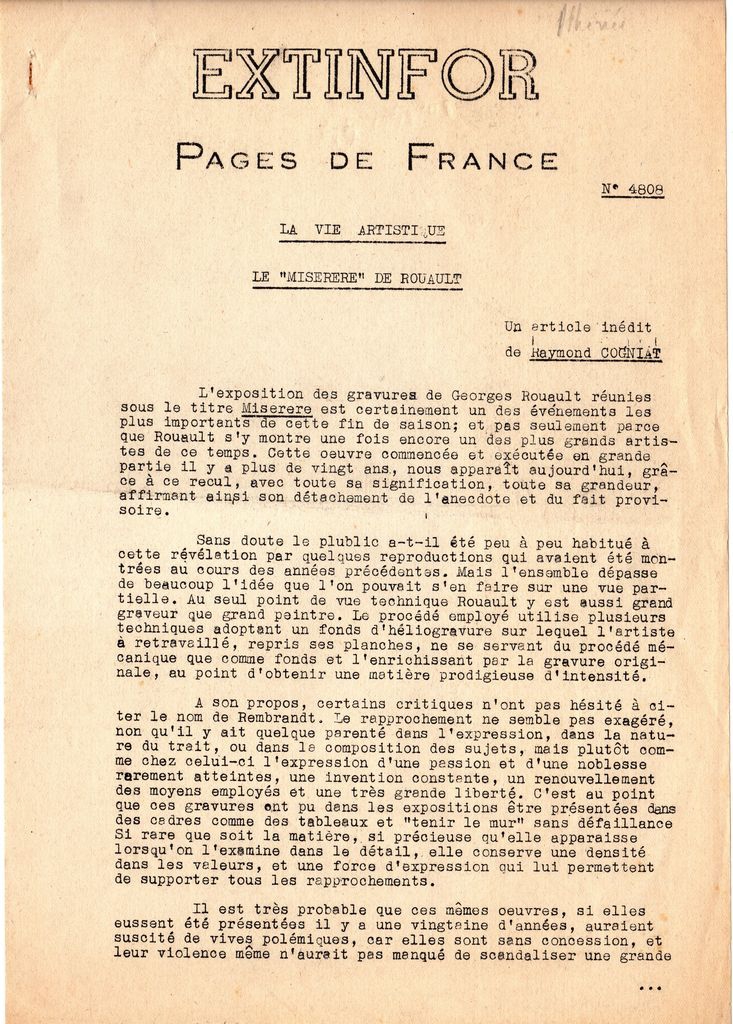 Απόκομμα, χαρτί, 3 φφ, 31×21 εκ., στα γαλλικά, δημοσίευσης άρθρου αναφερόμενου στη σειρά έργων του Georges Rouault “Miserère”.