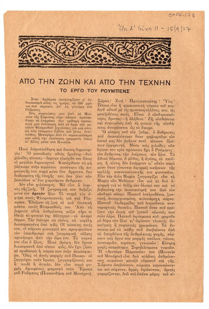 Απόκομμα, χαρτί διπλής όψης, 25×16.5 εκ., στα ελληνικά, δημοσίευσης άρθρου αναφερόμενου στη ζωγραφική του Peter Paul Rubens. Αναγράφονται λεπτομέρειες.