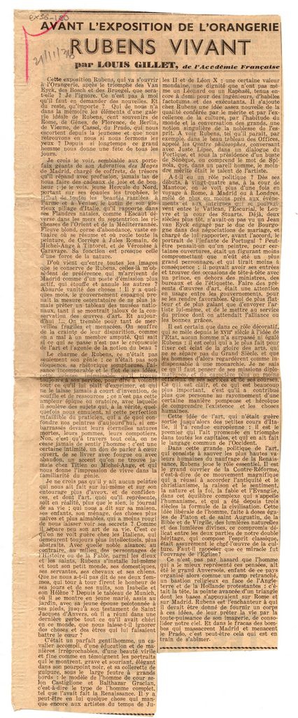 Απόκομμα, χαρτί, 39×14.5 εκ., στα γαλλικά, δημοσίευσης άρθρου αφιερωμένου στη ζωγραφική του Peter Paul Rubens, με αφορμή αναδρομική έκθεση έργων του ίδιου και συγχρόνων του καλλιτεχνών, η οποία διεξάγεται στην Orangerie στο Παρίσι.