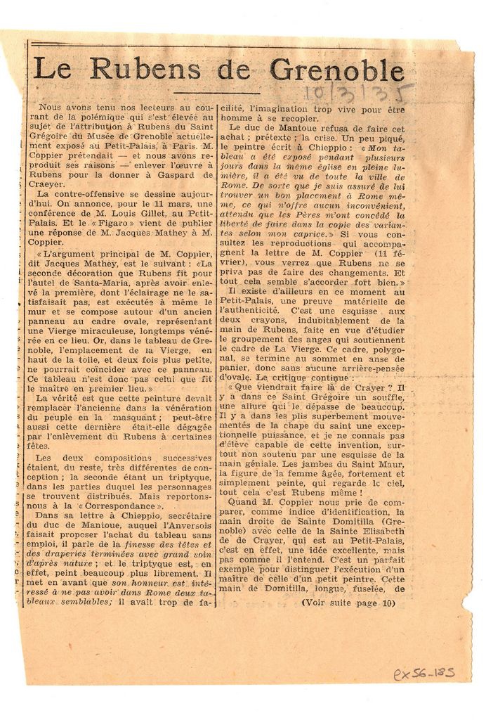 Απόκομμα, χαρτί διπλής όψης, 20×14 εκ., στα γαλλικά, δημοσίευσης άρθρου το οποίο αναφέρεται σε ζητήματα πατρότητας έργου του Peter Paul Rubens. Αναγράφονται λεπτομέρειες.