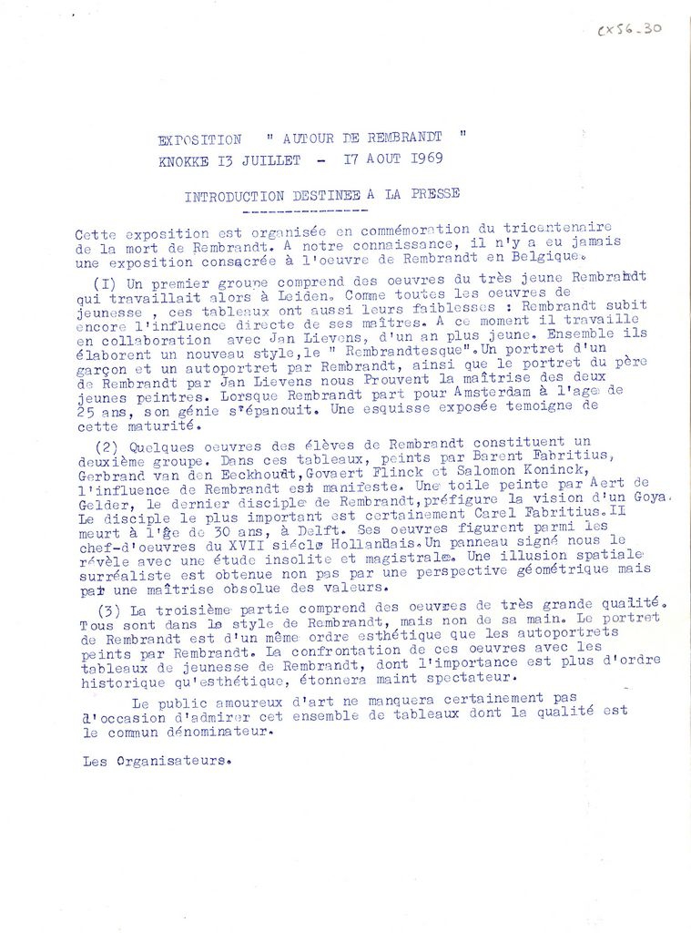 Δελτίο τύπου, δακτυλόγραφο, χαρτί, 28×21 εκ., στα γαλλικά, έκθεσης με τίτλο “Autour de Rembrandt”, στην οποία παρουσιάζονται έργα του καλλιτέχνη, συγχρόνων του και μαθητών του. Αναγράφονται λεπτομέρειες για το περιεχόμενο και την διοργάνωση.