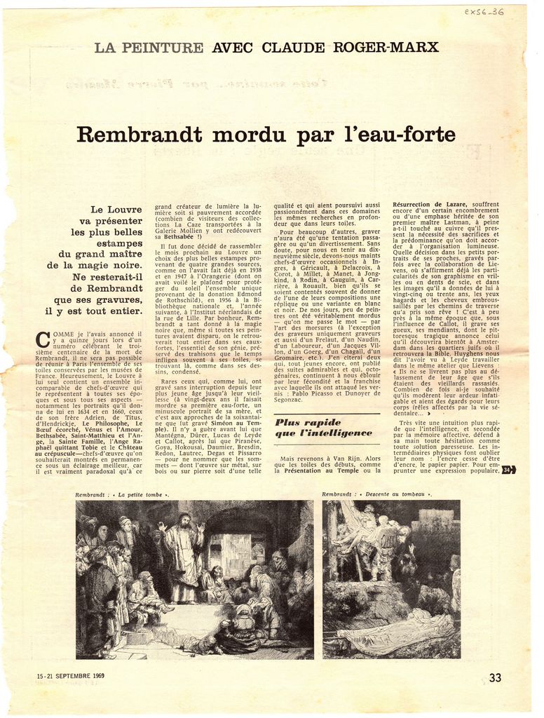 Απόκομμα, χαρτί διπλής όψης, 35×27 εκ., στα γαλλικά, δημοσίευσης κριτικής αναδρομικής έκθεσης Rembrandt η οποία διεξάγεται στο Λούβρο. Παρουσιάζονται έργα του καλλιτέχνη που φυλάσσονται σε συλλογές γαλλικών μουσείων.