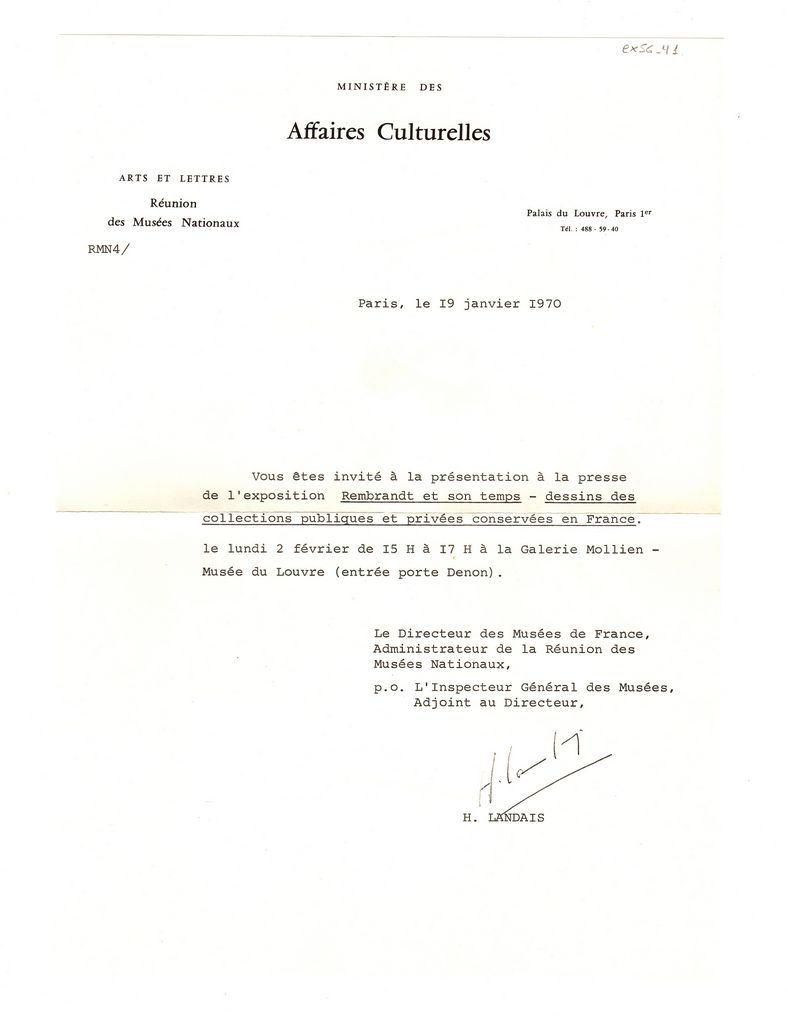 Πρόσκληση- επιστολή, χαρτί, 28×21 εκ., στα γαλλικά, σε εγκαίνια για τους εκπροσώπους του Τύπου σε έκθεση Rembrandt η οποία διεξάγεται στο Λούβρο στο Παρίσι.