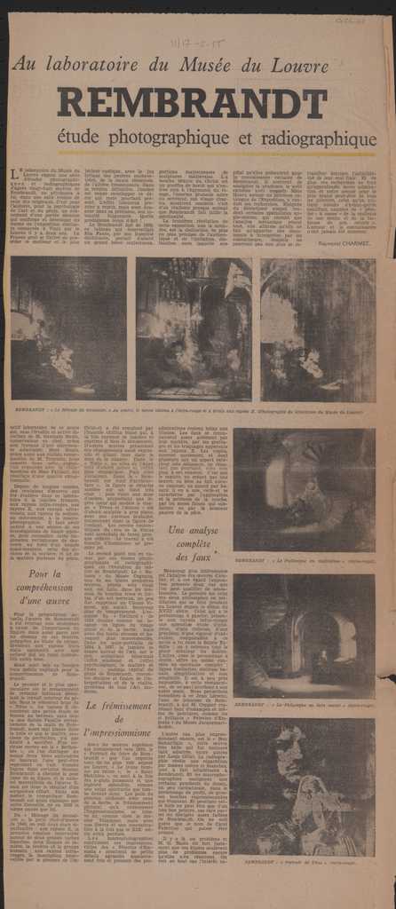 Απόκομμα, χαρτί, 60×26 εκ., στα γαλλικά, δημοσίευσης κριτικής έκθεσης φωτογραφιών και ραδιογραφιών έργων του Rembrandt, τα οποία παρουσιάζονται σε έκθεση στο Λούβρο. Αναγράφονται λεπτομέρειες για την διοργάνωση της έκθεσης.