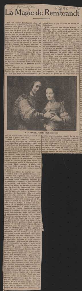 Απόκομμα, χαρτί ακανόνιστου μεγέθους, στα γαλλικά, δημοσίευσης άρθρου αναφερόμενου σε έργα του Rembrandt τα οποία σχολιάζονται με αφορμή αναδρομική έκθεση η οποία διεξάγεται στο Rijksmuseum στο Άμστερνταμ.