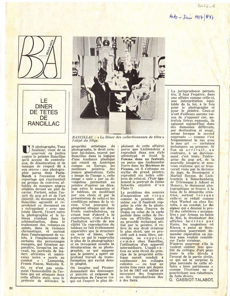 Απόκομμα, χαρτί, 28×21 εκ., στα γαλλικά, δημοσίευσης άρθρου αναφερόμενου σε έργο του Bernard Rancillac, το οποίο έγειρε αντιδράσεις για το περιεχόμενό του.