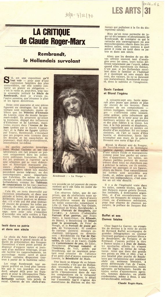 Απόκομμα, χαρτί, 36×20 εκ., στα γαλλικά, δημοσίευσης κριτικής έκθεσης με θέμα τον αιώνα του Ρέμπραντ, η οποία διεξάγεται στο Petit Palais στο Παρίσι.