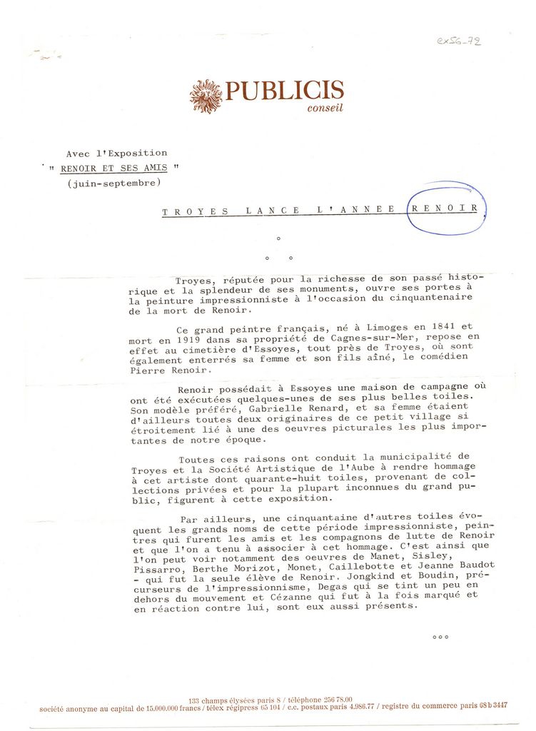 Δελτίο τύπου, χαρτί, 29.5×21 εκ., στα γαλλικά, έκθεσης αφιερωμένης στον Pierre Auguste Renoir η οποία διεξάγεται στην Troyes, με αφορμή την συμπλήρωση 50 χρόνων από τον θάνατο του καλλιτέχνη. Αναγράφονται λεπτομέρειες για την διοργάνωση.