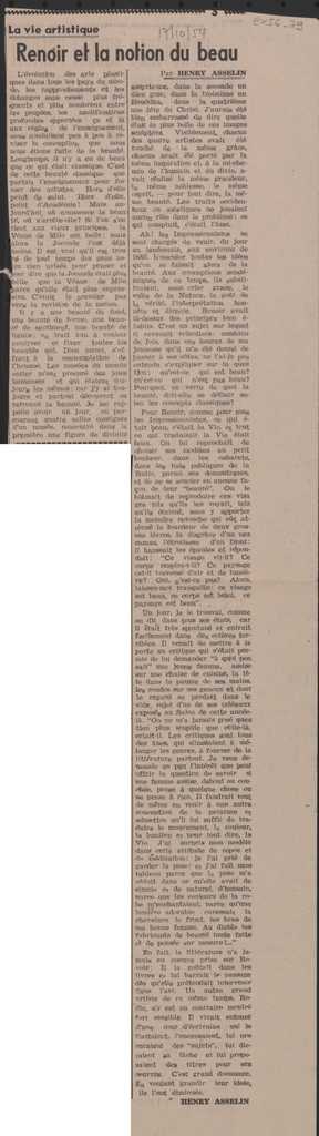 Απόκομμα, χαρτί ακανόνιστου μεγέθους, στα γαλλικά, δημοσίευσης άρθρου αναφερόμενου στο ωραίο στην τέχνη. Σχολιάζεται η ζωγραφική του Renoir, εκπροσώπου του Ιμπρεσιονισμού.
