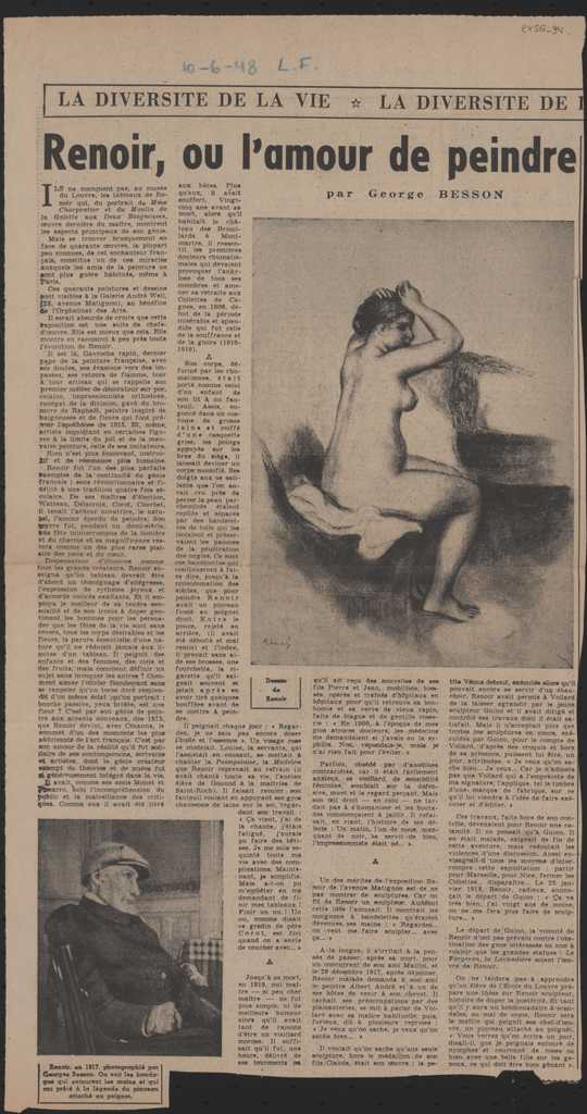 Απόκομμα, χαρτί, 46×24.5 εκ., στα γαλλικά, δημοσίευσης κριτικής έκθεσης Pierre Auguste Renoir, η οποία διεξάγεται στην γκαλερί André Weil στο Παρίσι. Αναγράφονται λεπτομέρειες για το περιεχόμενό της και για τη ζωή και το έργο του καλλιτέχνη.