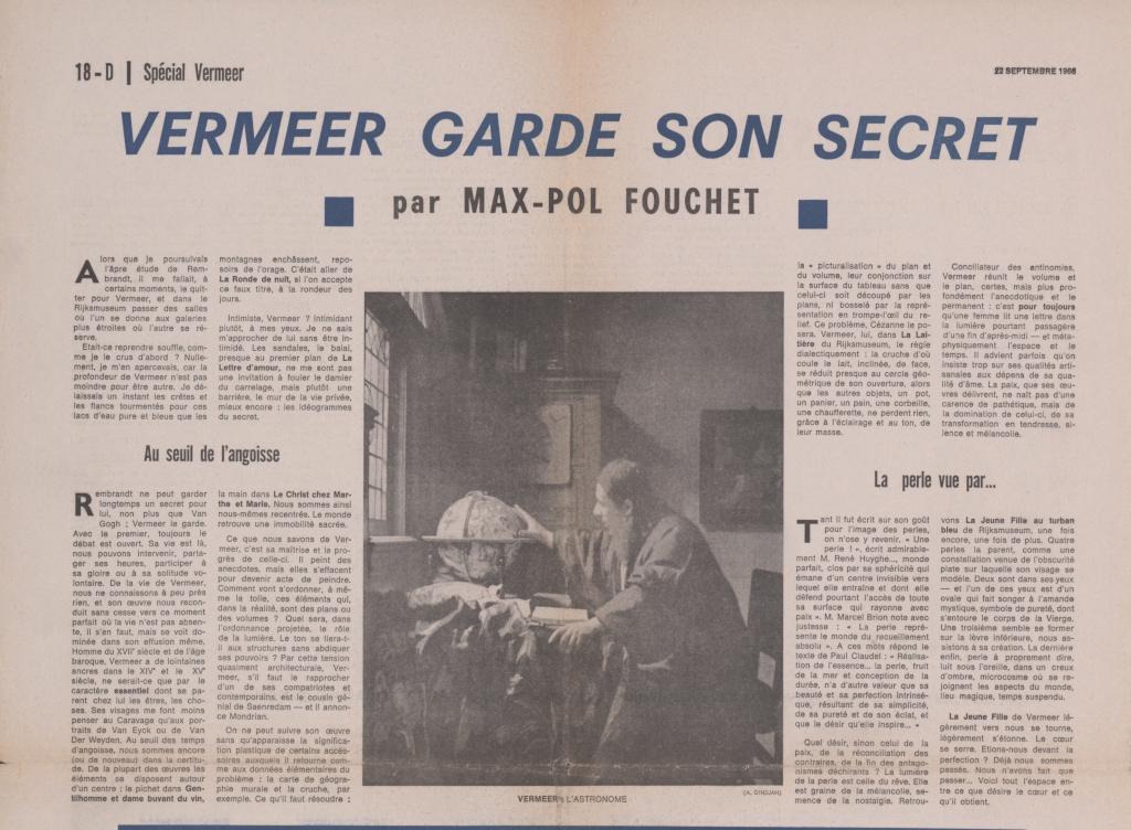 Απόκομμα, χαρτί, 60×43 εκ., στα γαλλικά, δημοσίευσης άρθρου το οποίο αναφέρεται στη ζωγραφική του Johannes Vermeer, με αφορμή αναδρομική έκθεση έργων του καλλιτέχνη και συγχρόνων του η οποία διεξάγεται στην Orangerie στο Παρίσι.