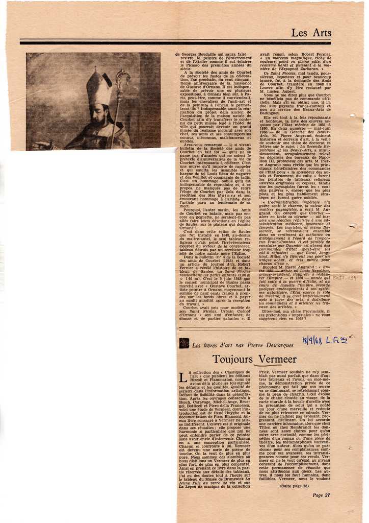 Απόκομμα, χαρτί ακανόνιστου μεγέθους, στα γαλλικά, δημοσίευσης άρθρου το οποίο αναφέρεται σε κυκλοφορία βιβλίου αφιερωμένου στον Johannes Vermeer, το οποίο κυκλοφορία από τις εκδόσεις Rizzoli και Flamarrion. Σχολιάζεται η κυκλοφορία και αναγράφονται λεπτομέρειες για τον καλλιτέχνη και το έργο του.