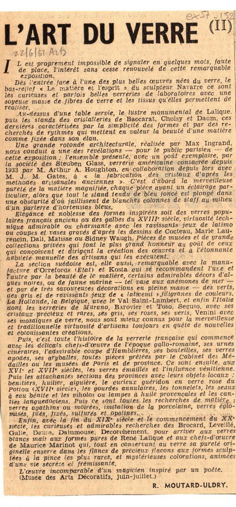 Απόκομμα, χαρτί, 20×10 εκ., στα γαλλικά, δημοσίευσης συνέχειας άρθρου το οποίο αναφέρεται σε έκθεση έργων που φιλοτεχνήθηκαν από γυαλί, η οποία παρουσιάζεται στο Musée des Arts Décoratifs στο Παρίσι. Αναγράφονται λεπτομέρειες για έργα που παρουσιάζονται σε αυτή καθώς και για την εξέλιξη της τέχνης σε γυαλί.