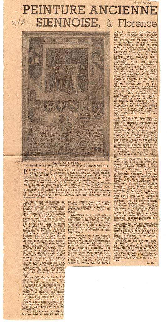 Απόκομμα, χαρτί, 34×17 εκ., στα γαλλικά, δημοσίευσης κριτικής του A.R. έκθεσης ιταλικής τέχνης της Σχολής της Σιένας, η οποία διεξάγεται στην Φλωρεντία. Σχολιάζεται το περιεχόμενό της, έργα που παρουσιάζονται σε αυτή.