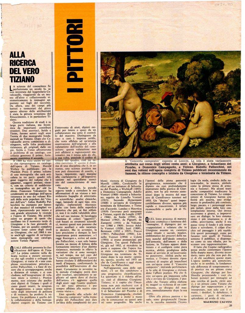 Απόκομμα, χαρτί, 34×26 εκ., στα ιταλικά, δημοσίευσης άρθρου αναφερόμενου στη ζωγραφική του Tizianno (Vecellio). Σχολιάζονται έργα του καλλιτέχνη.