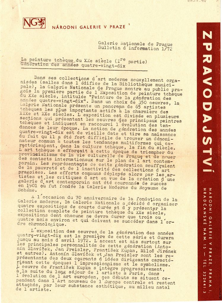 Δακτυλόγραφο δελτίο τύπου, χαρτί, 4 φφ, 30×21 εκ., στα γαλλικά, της Εθνικής Πινακοθήκης της Πράγας. Αναγράφονται λεπτομέρειες για εκθέσεις που διοργανώνονται από αυτή ανάμεσα στις οποίες αφιέρωμα στην τσέχικη τέχνη του 20ου αιώνα, έκθεση ρώσικης ξυλογραφίας, έκθεση γοτθικής τέχνης, έκθεση με θέμα την τοπιογραφία στην Ευρώπη, έκθεση μπαρόκ στο Βουκουρέστι, έκθεση Gutfreund και τσέχικου κυβισμού στην Ουγγαρία και έκθεση μπαρόκ στην Αμερική.