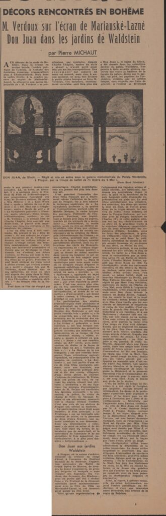 Απόκομμα, χαρτί, 60×43 εκ., στα γαλλικά, δημοσίευσης άρθρου το οποίο αναφέρεται κινηματογραφικό φεστιβάλ της Τσεχοσλοβακίας. Σχολιάζονται έργα που προβλήθηκαν σε αυτό. Ακόμη, σχολιάζεται η παραγωγή του ‘Δον Ζουάν’ του Gluck, από το Μπαλέτο της Όπερας της Μόσχας, που παρουσιάζεται στο πλαίσιο του Φεστιβάλ Νέων της Πράγας. Εντάσσεται σε αφιέρωμα του εντύπου στην τέχνη της Τσεχοσλοβακίας.