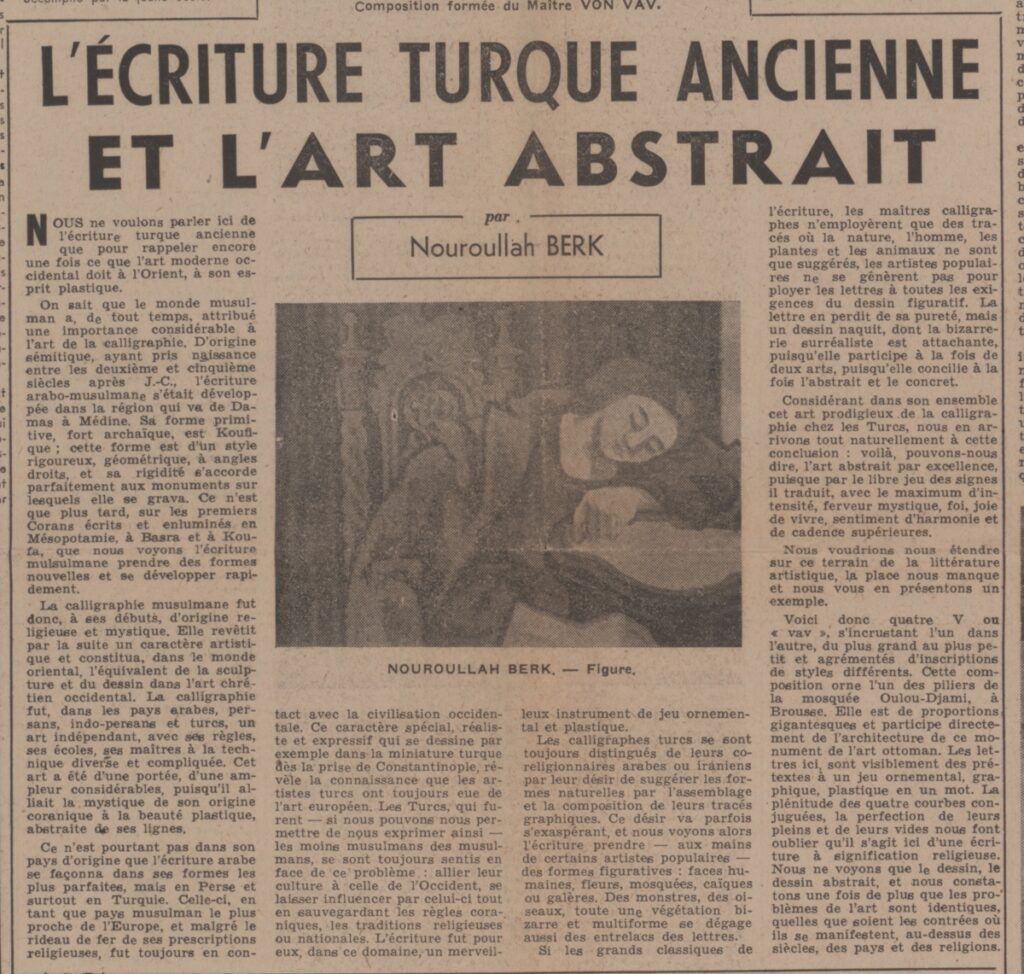 Απόκομμα, χαρτί, 60×43 εκ., στα γαλλικά, δημοσίευσης άρθρου το οποίο αναφέρεται στην τούρκικη καλλιγραφία. Εντάσσεται σε αφιέρωμα του εντύπου στην τούρκικη τέχνη.