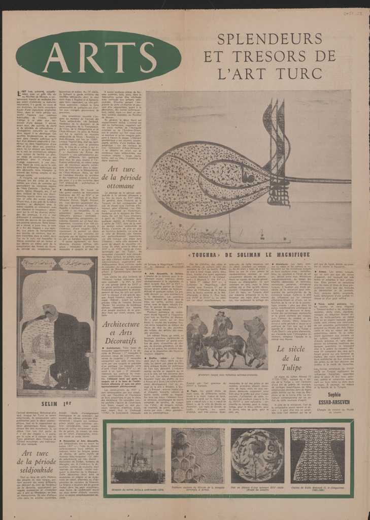 Απόκομμα, χαρτί, 60×43 εκ., στα γαλλικά, δημοσίευσης άρθρου αφιερωμένου στην τούρκικη τέχνη, με αφορμή θεματική έκθεση η οποία διεξάγεται στο Musée des Arts décoratifs στο Παρίσι.