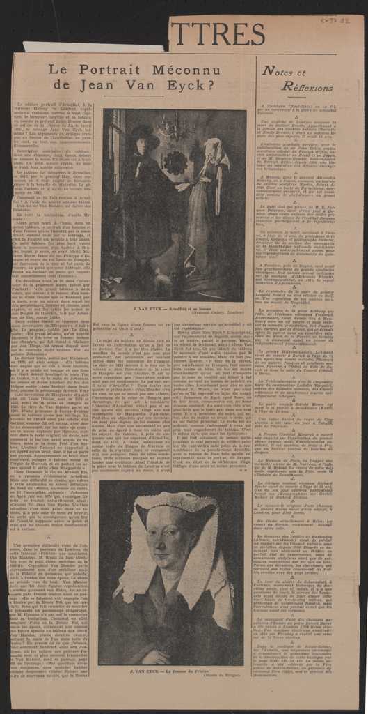 Απόκομμα, χαρτί, 51×26 εκ., στα γαλλικά, δημοσίευσης άρθρου αφιερωμένου στο έργο του Jan van Eyck “Arnolfini et sa femme”, το οποίο φυλάσσεται στη συλλογή της Εθνικής Πινακοθήκης στο Λονδίνο.