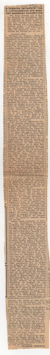 Απόκομμα της εφημερίδας “Τα Νέα” (26/01/1960), όπου δημοσιεύεται επιστολής του Μιχάλη Τόμπρου – απάντηση σε προηγούμενη επιστολή του Γιώργου Ζογγολόπουλου – αναφορικά με το θέμα του Μνημείου των Καλαβρύτων.