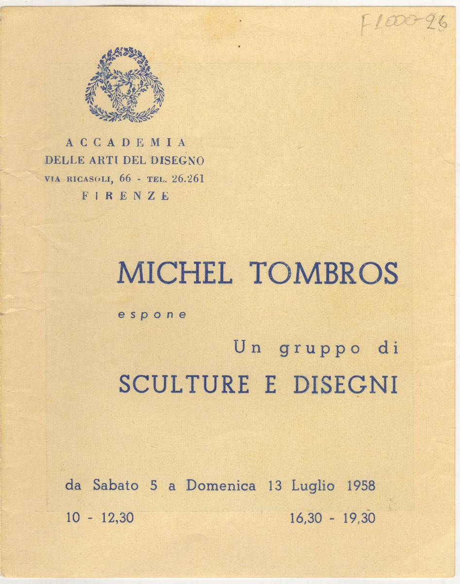 Έντυπο έκθεσης του Μιχάλη Τόμπρου στην Accademia delle arti del disegno στη Φλωρεντία. Περιέχει σύντομο βιογραφικό σημείωμα του καλλιτέχνη, αναφορά σε κριτικές στον Τύπο και εικονογράφηση.