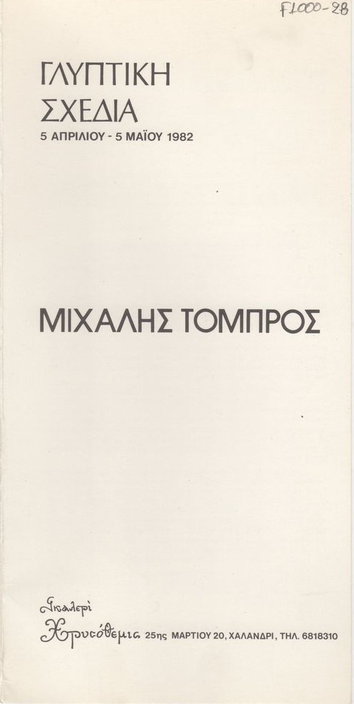 Έντυπο έκθεσης έργων του Μιχάλη Τόμπρου. Περιέχει βιογραφικό σημείωμα του καλλιτέχνη και κείμενο του Χατζηκυριάκου-Γκίκα.